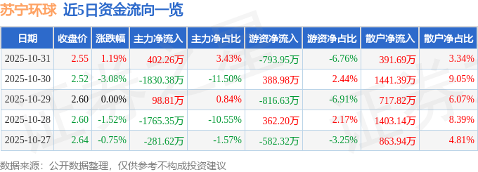 证券之星消息,截至2025年10月31日收盘,苏宁环球(000718)报收于2.55元,上涨1.19%,换手率2.03%,成交量46.31万手,成交额1.17亿元。