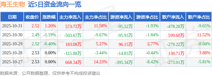 证券之星消息,截至2025年10月31日收盘,海王生物(000078)报收于2.52元,上涨1.2%,换手率0.75%,成交量19.74万手,成交额4954.13万元。