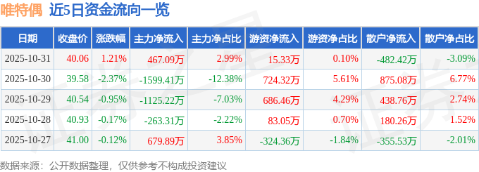 证券之星消息,截至2025年10月31日收盘,唯特偶(301319)报收于40.06元,上涨1.21%,换手率4.15%,成交量3.88万手,成交额1.56亿元。