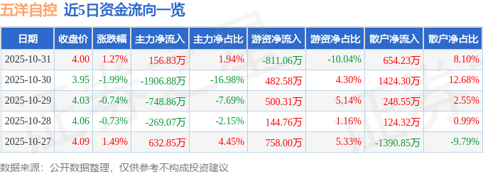 证券之星消息,截至2025年10月31日收盘,五洋自控(300420)报收于4.0元,上涨1.27%,换手率1.81%,成交量20.26万手,成交额8074.85万元。