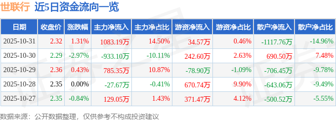证券之星消息,截至2025年10月31日收盘,世联行(002285)报收于2.32元,上涨1.31%,换手率1.64%,成交量32.37万手,成交额7470.98万元。