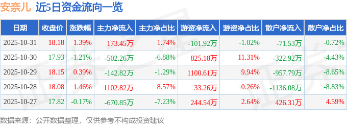 证券之星消息,截至2025年10月31日收盘,安奈儿(002875)报收于18.18元,上涨1.39%,换手率3.0%,成交量5.47万手,成交额9980.84万元。