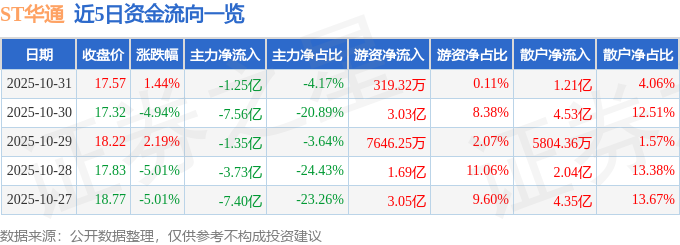 证券之星消息,截至2025年10月31日收盘,ST华通(002602)报收于17.57元,上涨1.44%,换手率2.45%,成交量168.05万手,成交额29.91亿元。