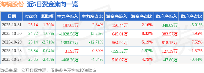 证券之星消息,截至2025年10月31日收盘,海锅股份(301063)报收于25.14元,上涨1.7%,换手率2.77%,成交量2.78万手,成交额6953.4万元。
