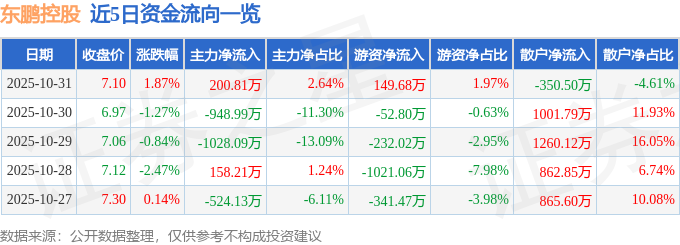 证券之星消息,截至2025年10月31日收盘,东鹏控股(003012)报收于7.1元,上涨1.87%,换手率0.94%,成交量10.75万手,成交额7609.02万元。