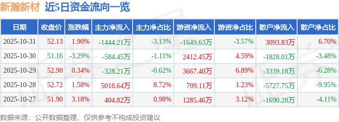 证券之星消息,截至2025年10月31日收盘,新瀚新材(301076)报收于52.13元,上涨1.9%,换手率8.05%,成交量8.84万手,成交额4.62亿元。