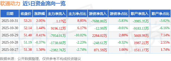 证券之星消息,截至2025年10月31日收盘,软通动力(301236)报收于53.21元,上涨2.05%,换手率3.19%,成交量24.95万手,成交额13.19亿元。