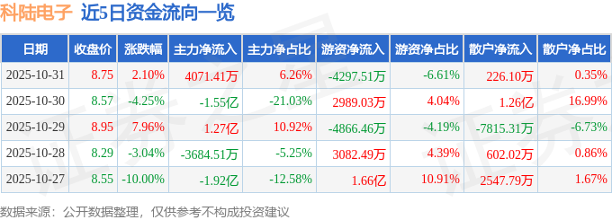 10月31日的资金流向数据方面,主力资金净流入4071.41万元,占总成交额6.26%,游资资金净流出4297.51万元,占总成交额6.61%,散户资金净流入226.1万元,占总成交额0.35%。