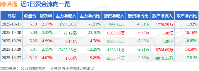证券之星消息,截至2025年10月31日收盘,跨境通(002640)报收于5.19元,上涨2.17%,换手率11.5%,成交量178.08万手,成交额9.25亿元。
