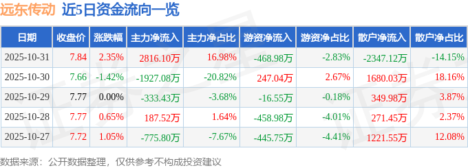 证券之星消息,截至2025年10月31日收盘,远东传动(002406)报收于7.84元,上涨2.35%,换手率3.53%,成交量21.29万手,成交额1.66亿元。