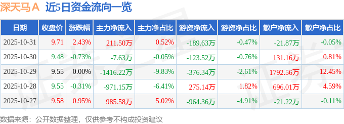 证券之星消息,截至2025年10月31日收盘,深天马A(000050)报收于9.71元,上涨2.43%,换手率1.69%,成交量41.57万手,成交额4.06亿元。