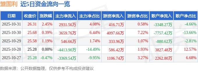 证券之星消息,截至2025年10月31日收盘,盟固利(301487)报收于26.31元,上涨2.45%,换手率9.95%,成交量27.15万手,成交额7.18亿元。