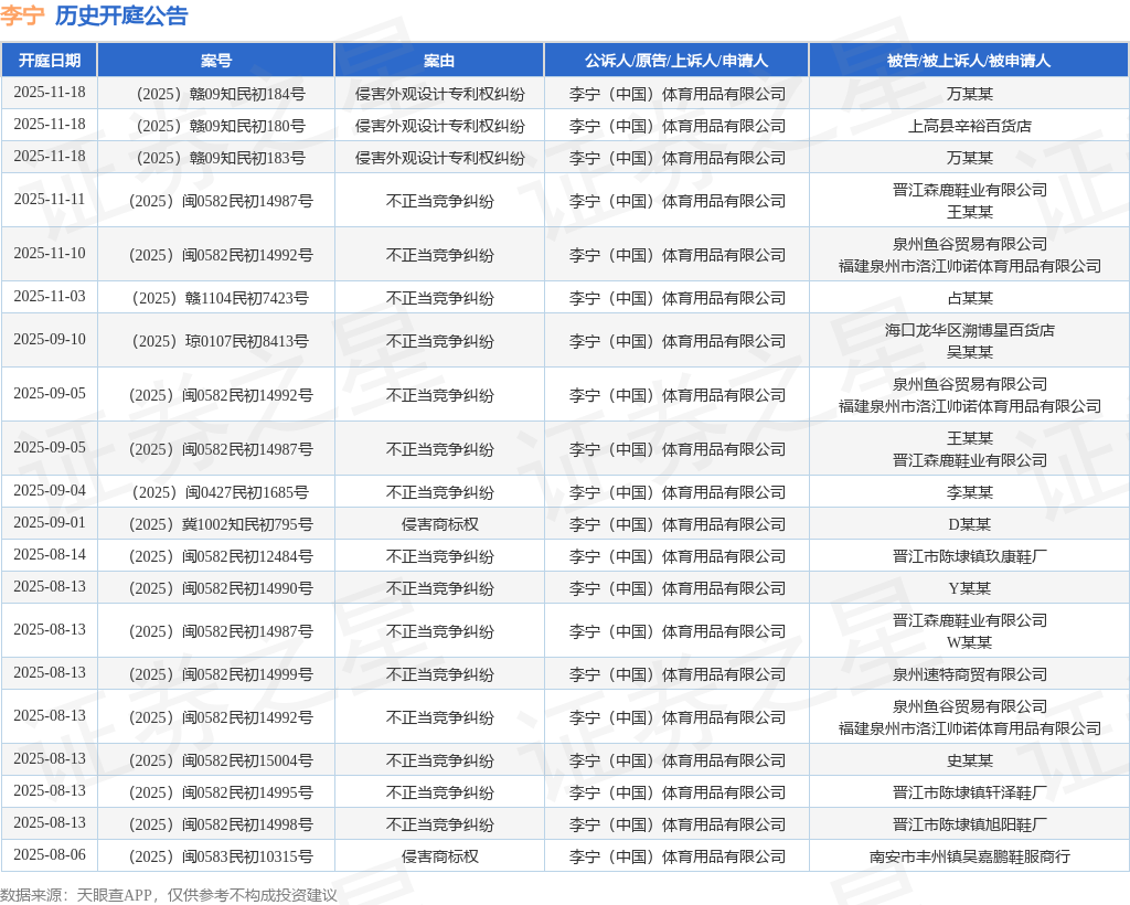 案号:(2025)赣1104民初7423号根据统计,近一年内以李宁(中国)体育用品有限公司为当事人的历史开庭公告有52则,其中案由为“不正当竞争纠纷”的公告以38则居首,其次为“侵害商标权纠纷”有5则,“侵害外观设计专利权纠纷”有3则。历史开庭公告(前20条)如下: