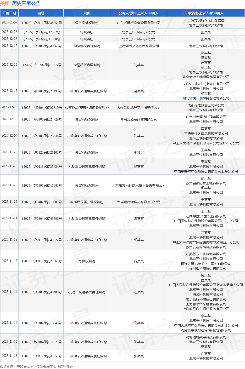 案号:(2025)粤1202民初6419号根据统计,近一年内以北京三快科技有限公司为当事人的历史开庭公告有699则,其中案由为“非机动车交通事故责任纠纷”的公告以176则居首,其次为“侵害商标权纠纷”有149则,“机动车交通事故责任纠纷”有98则。历史开庭公告(前20条)如下: