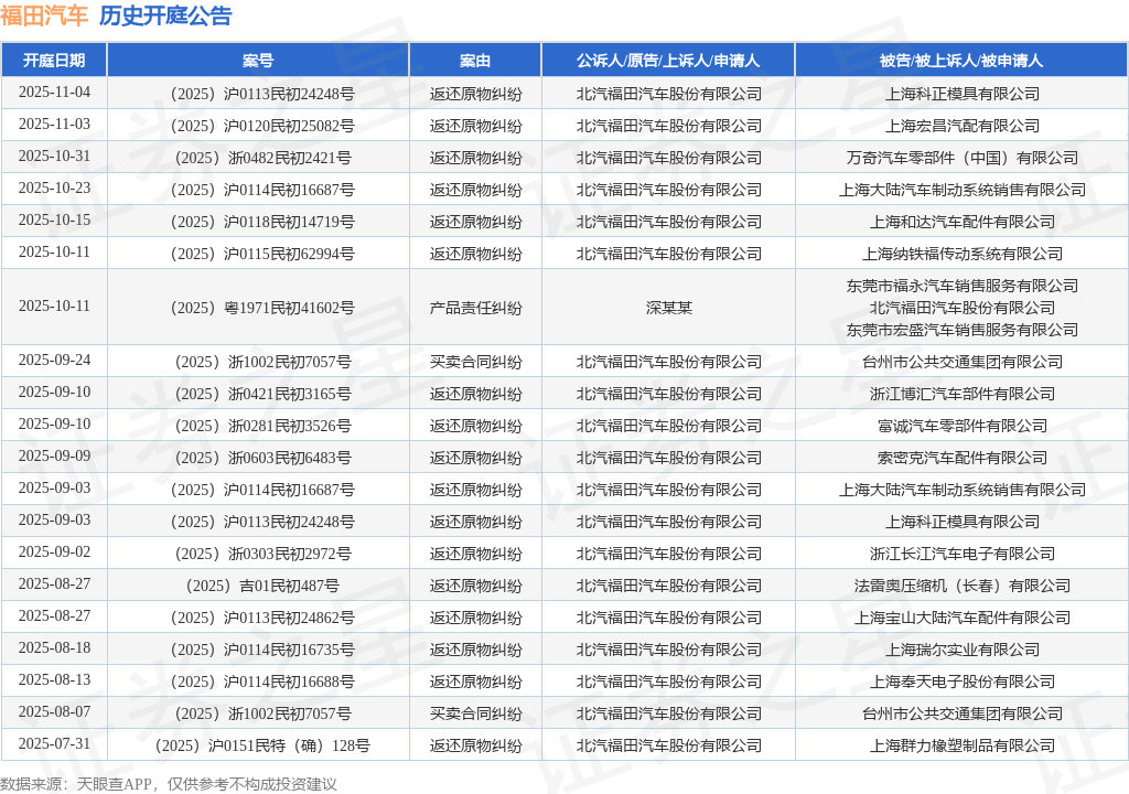 案号:(2025)沪0120民初25082号根据统计,近一年内以北汽福田汽车股份有限公司为当事人的历史开庭公告有63则,其中案由为“返还原物纠纷”的公告以47则居首,其次为“买卖合同纠纷”有9则,“产品责任纠纷”有3则。历史开庭公告(前20条)如下: