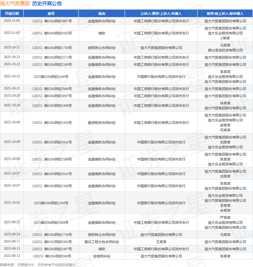 案号:(2025)冀0284民初2502号根据统计,近一年内以庞大汽贸集团股份有限公司为当事人的历史开庭公告有134则,其中案由为“金融借款合同纠纷”的公告以73则居首,其次为“劳动争议”有14则,“借款”有13则。历史开庭公告(前20条)如下: