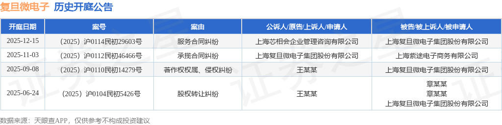 案号:(2025)沪0112民初46466号根据统计,近一年内以上海复旦微电子集团股份有限公司为当事人的历史开庭公告有4则,其中案由为“承揽合同纠纷”的公告以1则居首,其次为“服务合同纠纷”有1则,“股权转让纠纷”有1则。历史开庭公告如下: