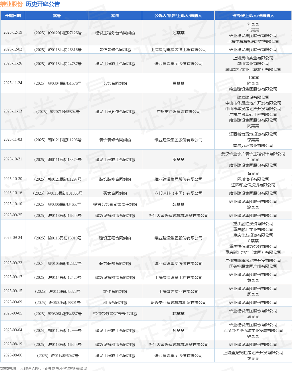 证券之星消息,根据天眼查APP显示,近日公布了一则维业建设集团股份有限公司作为原告/上诉人的开庭公告,详细内容如下:
