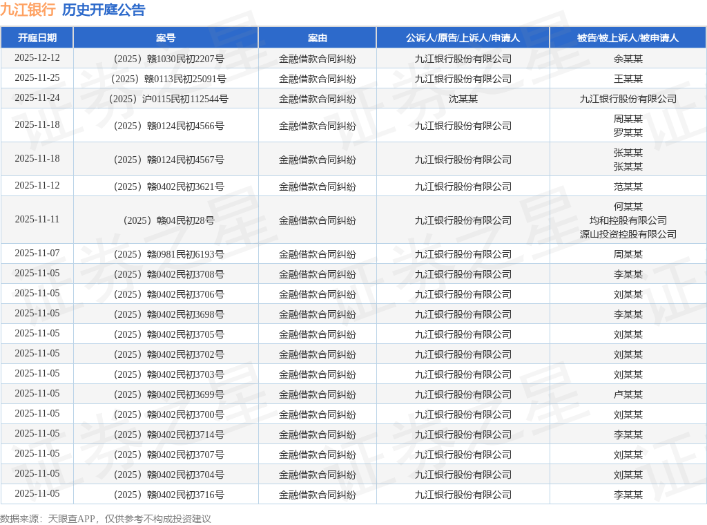 案号:(2025)赣0921民初2772号根据统计,近一年内以九江银行股份有限公司为当事人的历史开庭公告有796则,其中案由为“金融借款合同纠纷”的公告以707则居首,其次为“借款”有66则,“房屋买卖合同纠纷”有6则。历史开庭公告(前20条)如下: