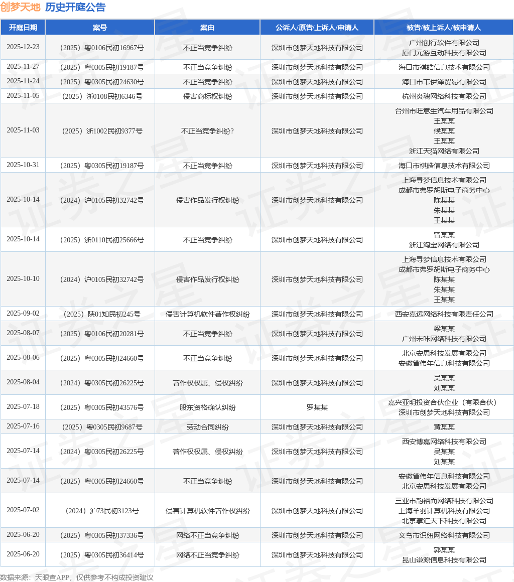 案号:(2025)浙1002民初9377号根据统计,近一年内以深圳市创梦天地科技有限公司为当事人的历史开庭公告有89则,其中案由为“不正当竞争纠纷”的公告以24则居首,其次为“网络不正当竞争纠纷”有22则,“侵害计算机软件著作权纠纷”有12则。历史开庭公告(前20条)如下: