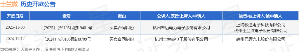 根据统计,近一年内以杭州士兰微电子股份有限公司为当事人的历史开庭公告有2则,其中案由为“买卖合同纠纷”的公告以2则居首。历史开庭公告如下: