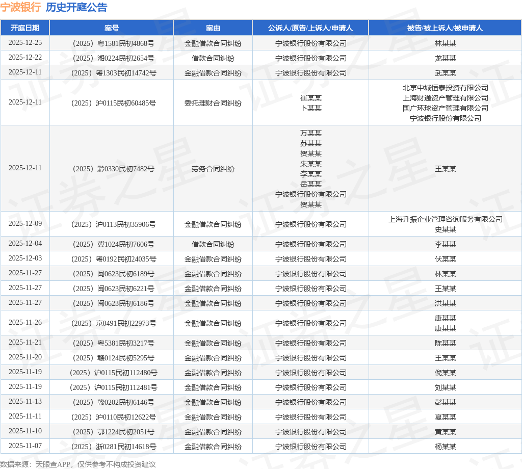 案号:(2025)浙0783民初14753号根据统计,近一年内以宁波银行股份有限公司为当事人的历史开庭公告有1833则,其中案由为“金融借款合同纠纷”的公告以1621则居首,其次为“借款”有121则,“借款合同纠纷”有52则。历史开庭公告(前20条)如下:
