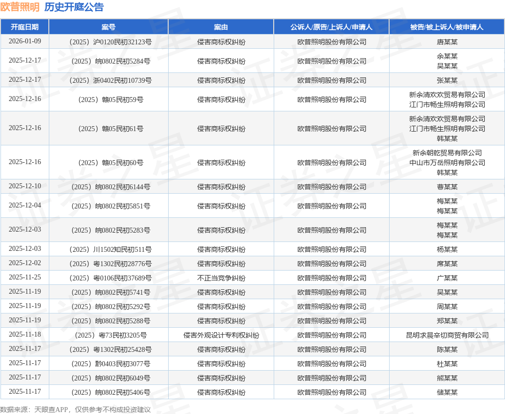 案号:(2025)赣0502知民初289号根据统计,近一年内以欧普照明股份有限公司为当事人的历史开庭公告有582则,其中案由为“侵害商标权纠纷”的公告以494则居首,其次为“侵害商标权”有25则,“商标权权属、侵权纠纷”有21则。历史开庭公告(前20条)如下:
