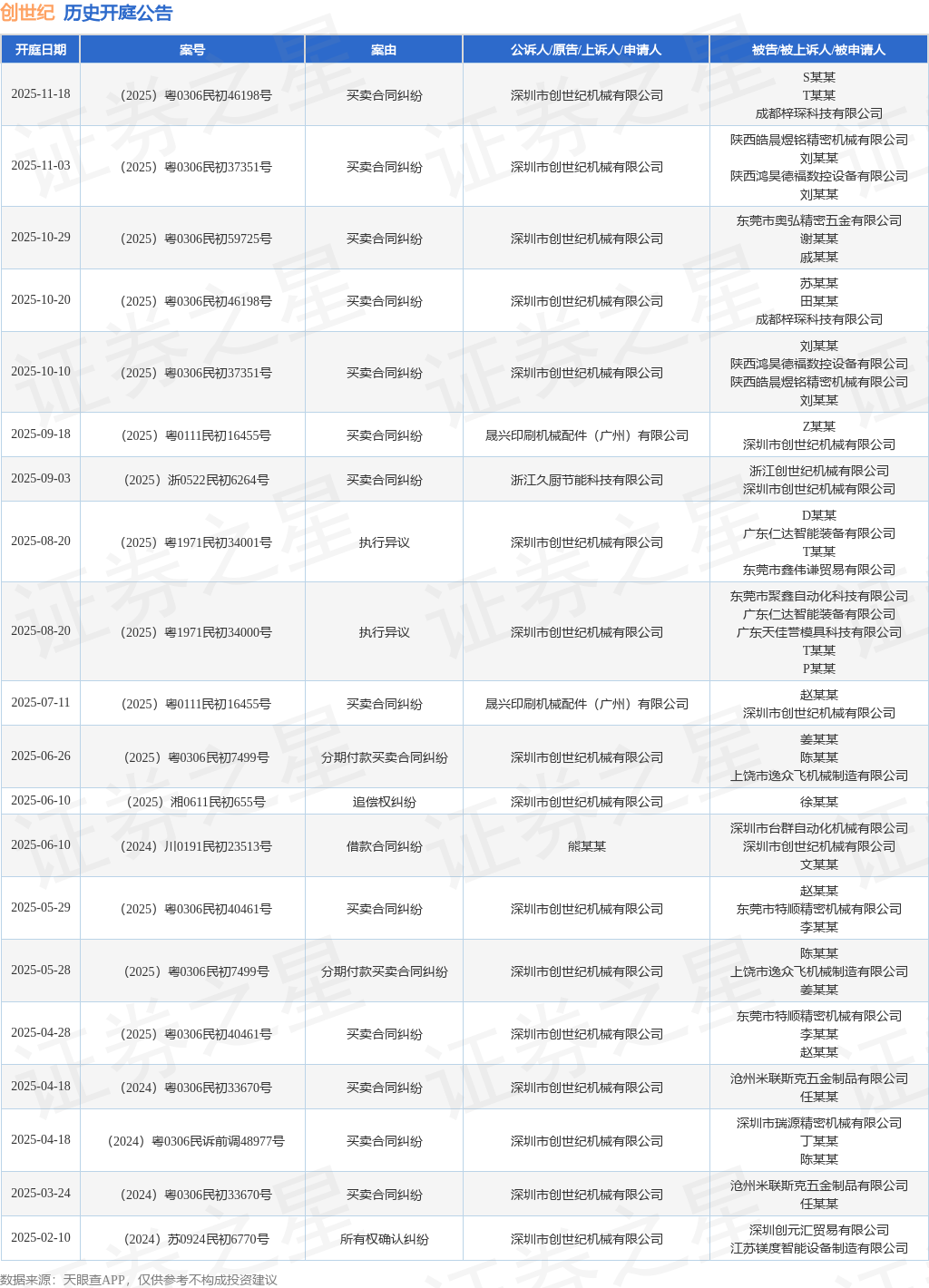 案号:(2025)粤0306民初37351号根据统计,近一年内以深圳市创世纪机械有限公司为当事人的历史开庭公告有23则,其中案由为“买卖合同纠纷”的公告以15则居首,其次为“分期付款买卖合同纠纷”有2则,“所有权确认纠纷”有2则。历史开庭公告(前20条)如下: