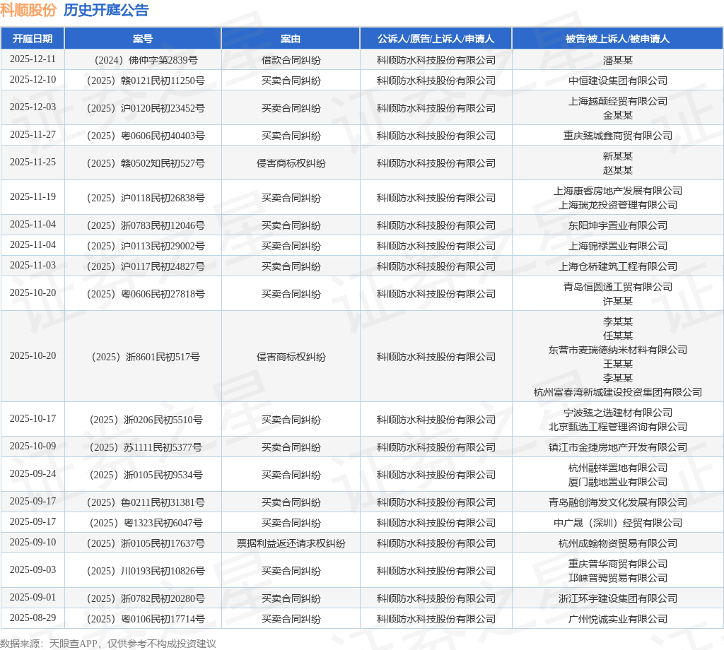 案号:(2025)沪0117民初24827号根据统计,近一年内以科顺防水科技股份有限公司为当事人的历史开庭公告有162则,其中案由为“买卖合同纠纷”的公告以106则居首,其次为“票据纠纷”有17则,“侵害商标权纠纷”有11则。历史开庭公告(前20条)如下: