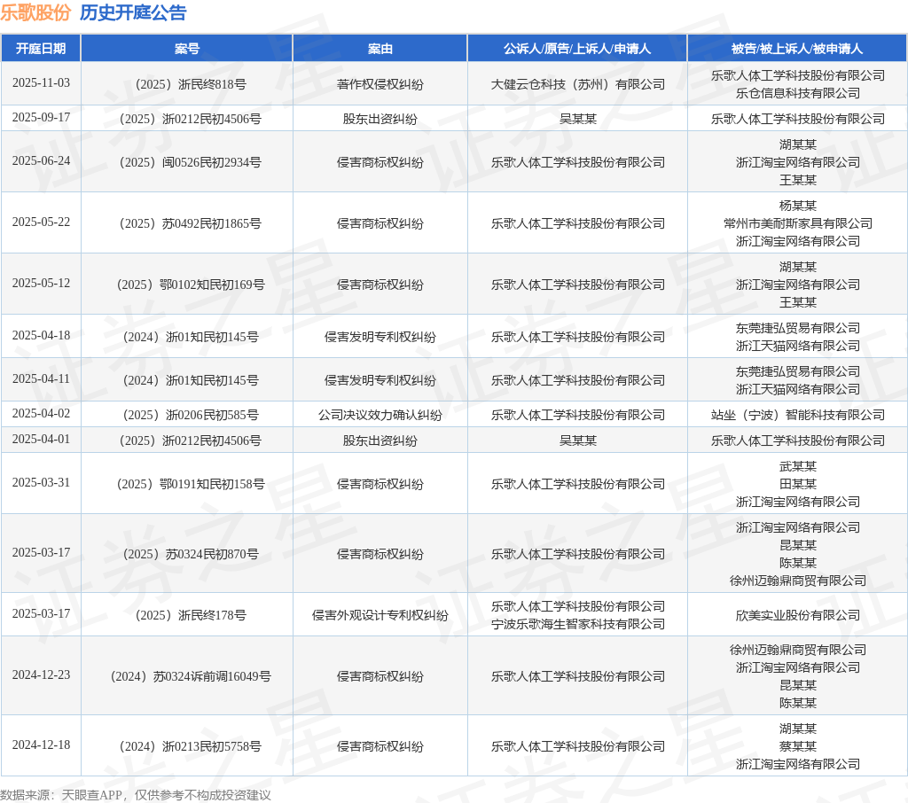 案号:(2025)浙民终818号根据统计,近一年内以乐歌人体工学科技股份有限公司为当事人的历史开庭公告有14则,其中案由为“侵害商标权纠纷”的公告以7则居首,其次为“侵害发明专利权纠纷”有2则,“股东出资纠纷”有2则。历史开庭公告如下: