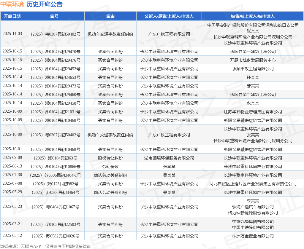 案号:(2025)粤0307民初50402号根据统计,近一年内以长沙中联重科环境产业有限公司为当事人的历史开庭公告有23则,其中案由为“买卖合同纠纷”的公告以16则居首,其次为“机动车交通事故责任纠纷”有2则,“确认劳动关系纠纷”有2则。历史开庭公告(前20条)如下: