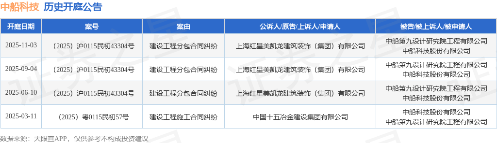 根据统计,近一年内以中船科技股份有限公司为当事人的历史开庭公告有4则,其中案由为“建设工程分包合同纠纷”的公告以3则居首,其次为“建设工程施工合同纠纷”有1则。历史开庭公告如下: