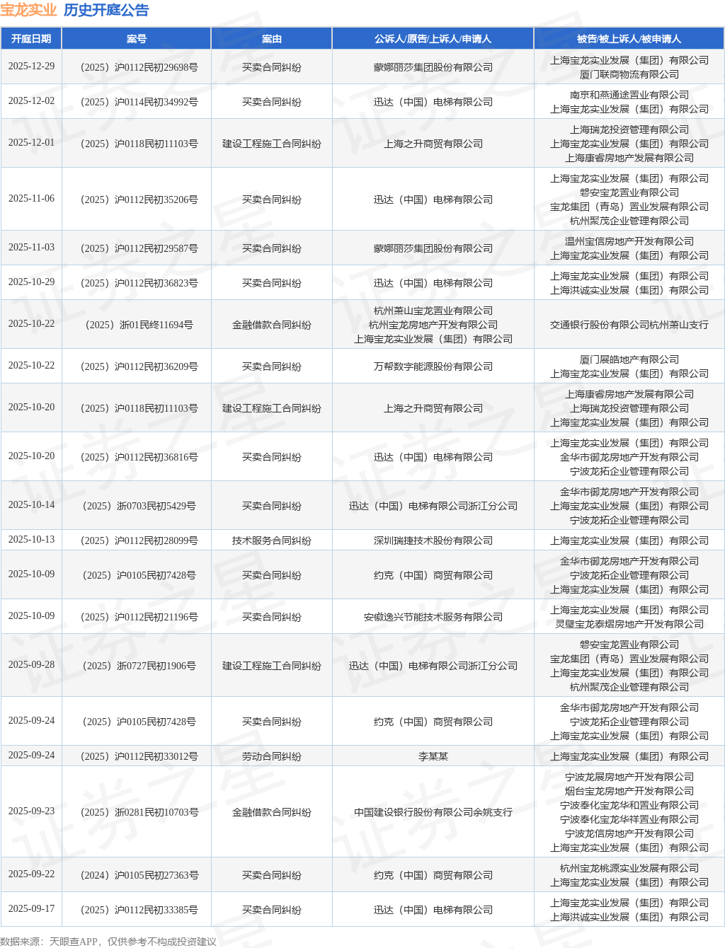 案号:(2025)沪0112民初29587号根据统计,近一年内以上海宝龙实业发展(集团)有限公司为当事人的历史开庭公告有121则,其中案由为“买卖合同纠纷”的公告以72则居首,其次为“建设工程施工合同纠纷”有11则,“合同纠纷”有6则。历史开庭公告(前20条)如下: