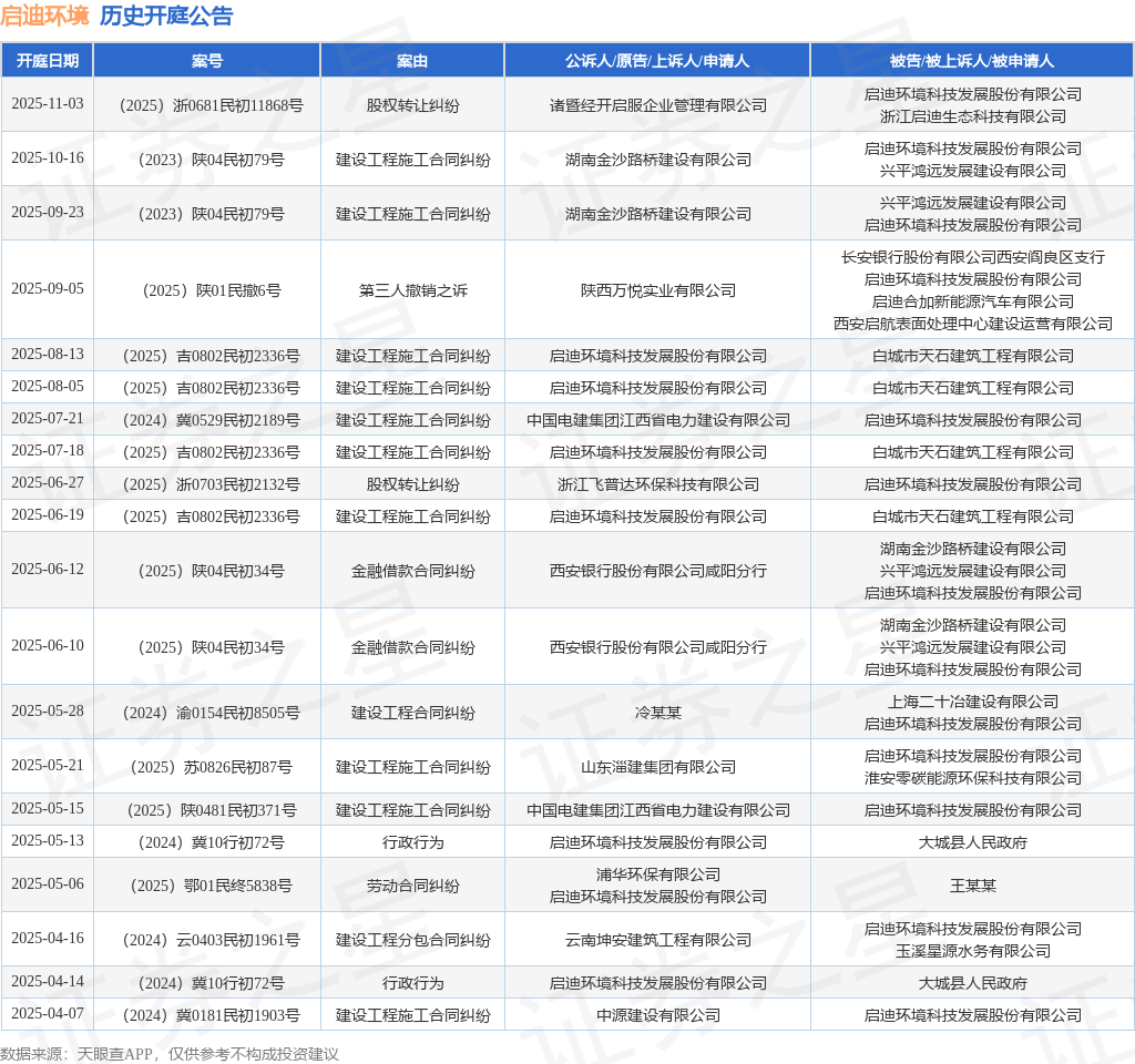 案号:(2025)浙0681民初11868号根据统计,近一年内以启迪环境科技发展股份有限公司为当事人的历史开庭公告有39则,其中案由为“建设工程施工合同纠纷”的公告以21则居首,其次为“建设工程合同纠纷”有4则,“行政行为”有3则。历史开庭公告(前20条)如下: