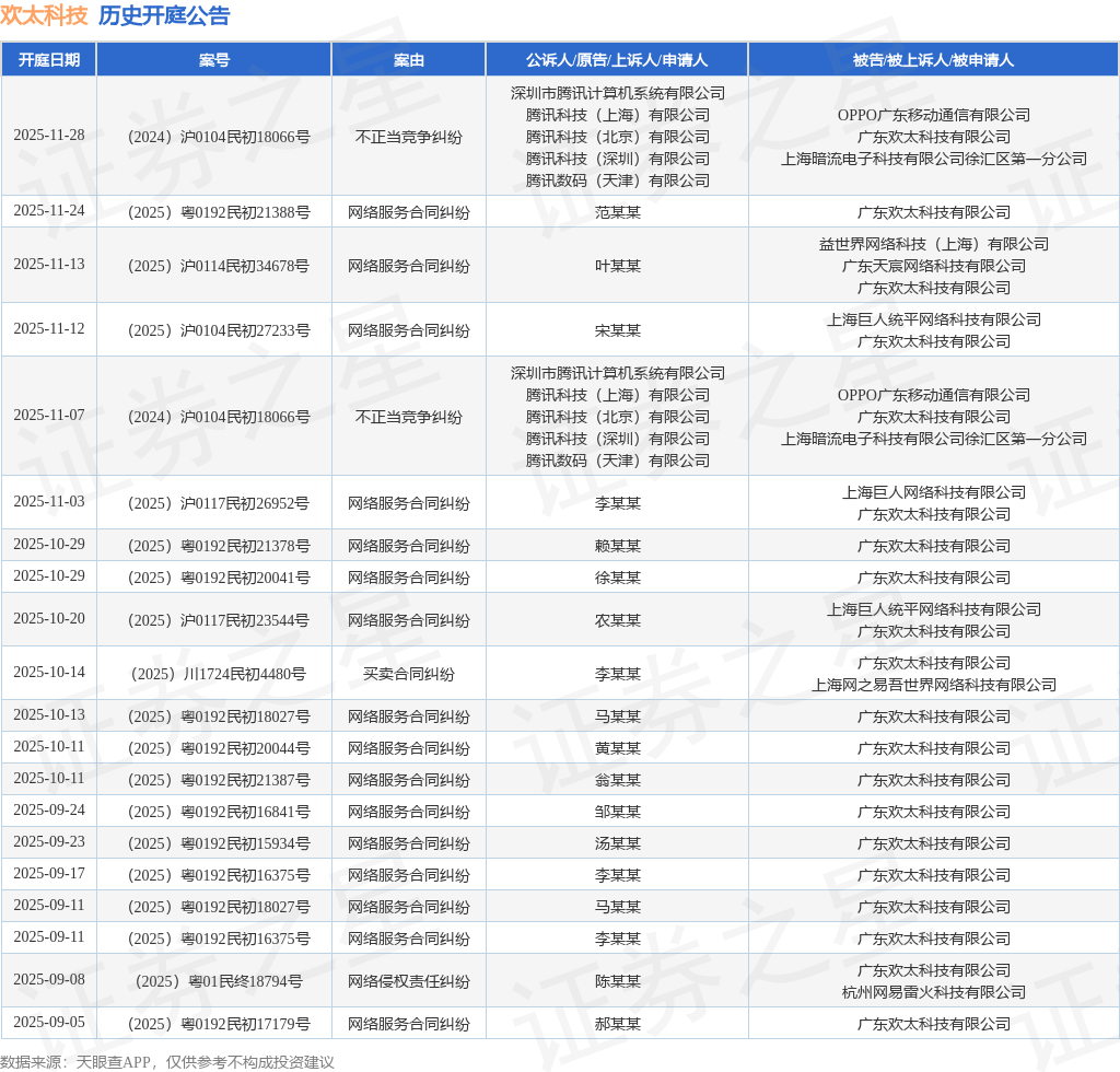 案号:(2025)沪0117民初26952号根据统计,近一年内以广东欢太科技有限公司为当事人的历史开庭公告有116则,其中案由为“网络服务合同纠纷”的公告以90则居首,其次为“网络不正当竞争纠纷”有9则,“买卖合同纠纷”有4则。历史开庭公告(前20条)如下: