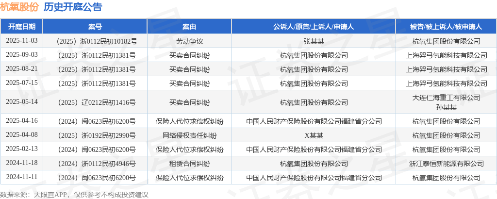 案号:(2025)浙0112民初10182号根据统计,近一年内以杭氧集团股份有限公司为当事人的历史开庭公告有10则,其中案由为“买卖合同纠纷”的公告以4则居首,其次为“保险人代位求偿权纠纷”有3则,“劳动争议”有1则。历史开庭公告如下: