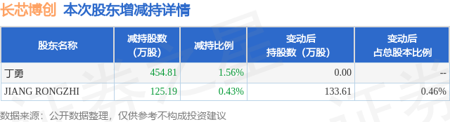 证券之星消息,10月31日长芯博创发布公告《长芯博创:长芯博创科技股份有限公司关于特定股东股份减持完成的公告》,其股东丁勇、JIANG RONGZHI于2025年10月28日至2025年10月30日间合计减持580.0万股,占公司目前总股本的1.9924%,变动期间该股股价下跌8.65%,截止10月30日收盘报106.06元。
