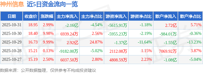 证券之星消息,截至2025年10月31日收盘,神州信息(000555)报收于18.95元,上涨2.99%,换手率25.27%,成交量245.62万手,成交额47.67亿元。