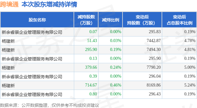 证券之星消息,10月31日跨境通发布公告《跨境通:关于持股5%以上股东股份减持至5%以下暨权益变动的提示性公告》,其股东杨建新、新余睿景企业管理服务有限公司于2025年10月23日至2025年10月30日间合计减持1443.06万股,占公司目前总股本的0.9262%,变动期间该股股价上涨4.53%,截止10月30日收盘报5.08元。