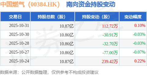 证券之星消息,10月31日南向资金增持112.72万股中国燃气(00384.HK)。近5个交易日中,获南向资金增持的有2天,累计净增持211.53万股。近20个交易日中,获南向资金增持的有10天,累计净增持455.06万股。截至目前,南向资金持有中国燃气(00384.HK)10.87亿股,占公司已发行普通股的19.93%。