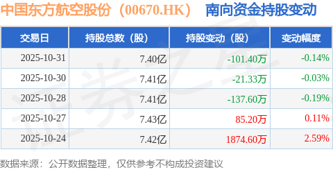证券之星消息,10月31日南向资金减持101.4万股中国东方航空股份(00670.HK)。近5个交易日中,获南向资金增持的有2天,累计净增持1699.47万股。近20个交易日中,获南向资金增持的有15天,累计净增持1.22亿股。截至目前,南向资金持有中国东方航空股份(00670.HK)7.4亿股,占公司已发行普通股的14.28%。