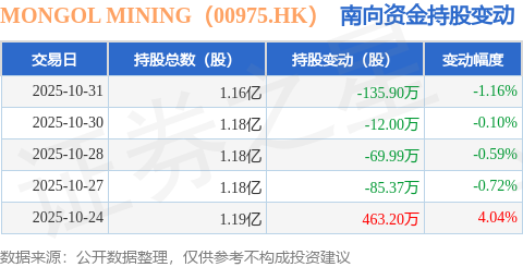 证券之星消息,10月31日南向资金减持135.9万股MONGOL MINING(00975.HK)。近5个交易日中,获南向资金增持的有1天,累计净增持159.94万股。近20个交易日中,获南向资金增持的有11天,累计净增持803.94万股。截至目前,南向资金持有MONGOL MINING(00975.HK)1.16亿股,占公司已发行普通股的nan%。