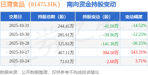 证券之星消息,10月31日南向资金减持41.5万股日清食品(01475.HK)。近5个交易日中,获南向资金增持的有2天,累计净增持174.4万股。近20个交易日中,获南向资金增持的有9天,累计净增持169.5万股。截至目前,南向资金持有日清食品(01475.HK)244.41万股,占公司已发行普通股的0.22%。