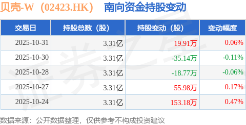证券之星消息,10月31日南向资金增持19.91万股贝壳-W(02423.HK)。近5个交易日中,获南向资金增持的有3天,累计净增持175.16万股。近20个交易日中,获南向资金增持的有18天,累计净增持3028.4万股。截至目前,南向资金持有贝壳-W(02423.HK)3.31亿股,占公司已发行普通股的9.32%。