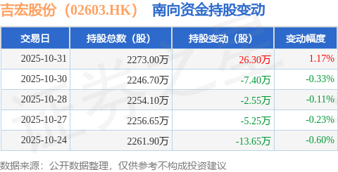 证券之星消息,10月31日南向资金增持26.3万股吉宏股份(02603.HK)。近5个交易日中,获南向资金减持的有4天,累计净减持2.55万股。近20个交易日中,获南向资金减持的有14天,累计净减持32.1万股。截至目前,南向资金持有吉宏股份(02603.HK)2273.0万股,占公司已发行普通股的33.46%。