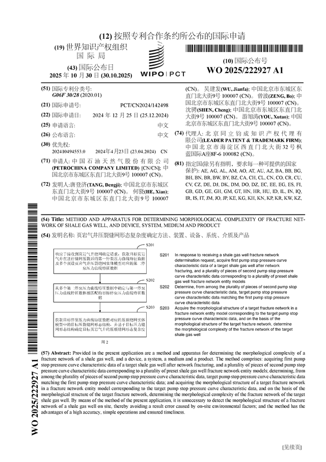 证券之星消息,根据企查查数据显示中国石油(601857)公布了一项国际专利申请,专利名为“页岩气井压裂缝网形态复杂度确定方法、装置、设备、系统、介质及产品”,专利申请号为PCT/CN2024/142498,国际公布日为2025年10月30日。
