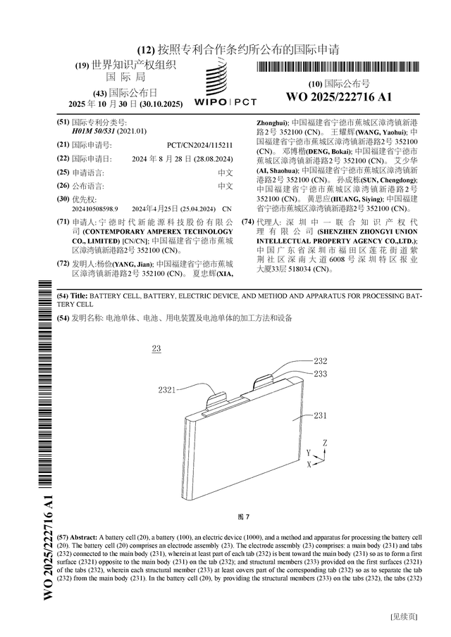 证券之星消息,根据企查查数据显示宁德时代(300750)公布了一项国际专利申请,专利名为“电池单体、电池、用电装置及电池单体的加工方法和设备”,专利申请号为PCT/CN2024/115211,国际公布日为2025年10月30日。