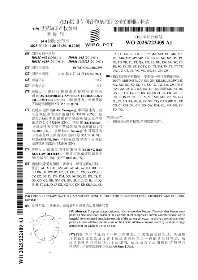 证券之星消息,根据企查查数据显示宁德时代(300750)公布了一项国际专利申请,专利名为“二次电池、负极极片的制备方法及用电装置”,专利申请号为PCT/CN2024/089595,国际公布日为2025年10月30日。