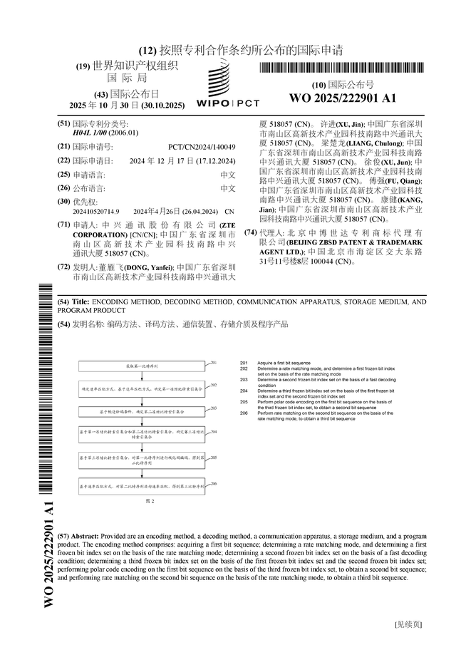 证券之星消息,根据企查查数据显示中兴通讯(000063)公布了一项国际专利申请,专利名为“编码方法、译码方法、通信装置、存储介质及程序产品”,专利申请号为PCT/CN2024/140049,国际公布日为2025年10月30日。