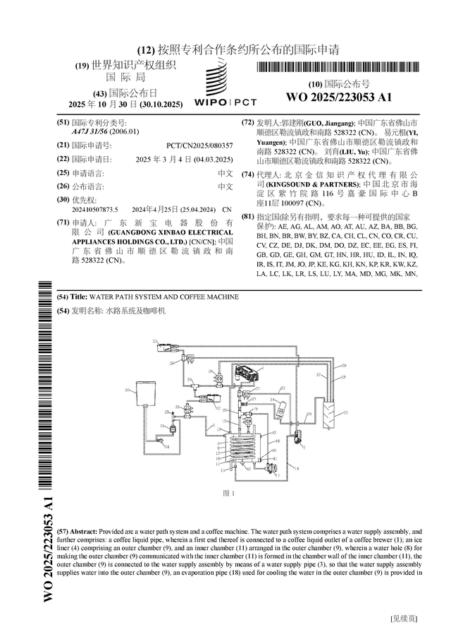 证券之星消息,根据企查查数据显示新宝股份(002705)公布了一项国际专利申请,专利名为“水路系统及咖啡机”,专利申请号为PCT/CN2025/080357,国际公布日为2025年10月30日。